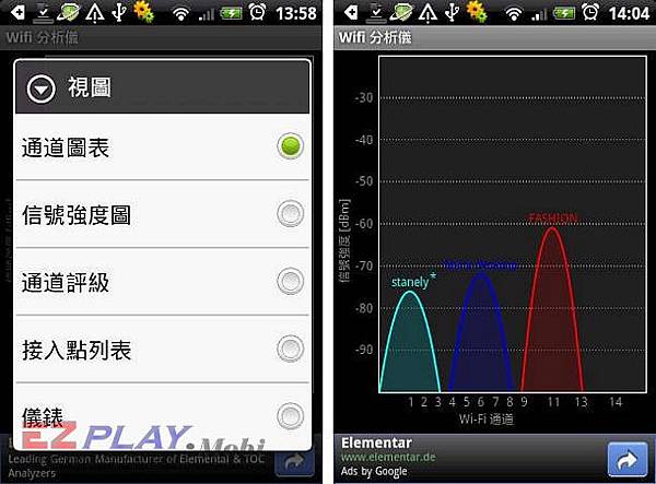 開啟「WiFi分析儀」預設會顯示「通道圖表」,將周遭可以接收到的無線熱點名稱及其信號強度