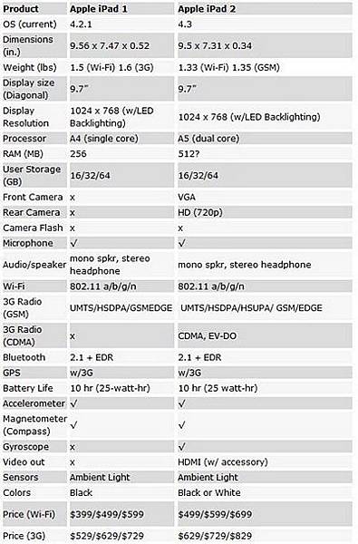 上圖是 FruPis.com 所整理 iPad 與 iPad2 的比較表,可以看出,二者在螢幕尺寸、
