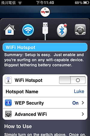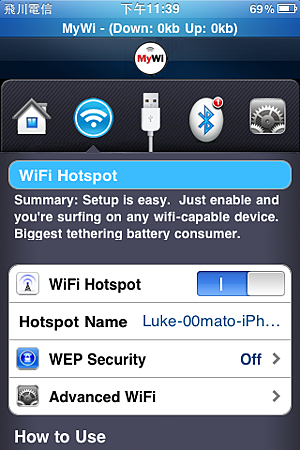 我們點擊WiFi Hotspot 開啟無線分享功能
