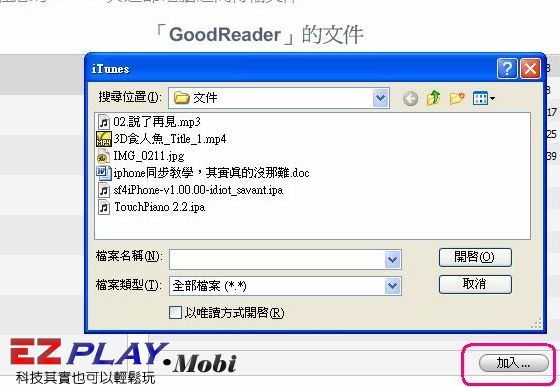 - iTunes傳輸同步方式:先將傳輸線連接電腦>iTunes應用程式下面檔案共享會看到GoodReader>開啟加入要傳送檔案資料文件iTunes會自動同步>再回到iPhone會看傳送完成的檔案資料。