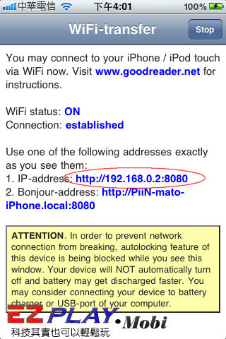 2. WiFi傳輸同步方式:開起GoodReader點選下WiFi鍵 >在電腦開啟瀏覽器上面輸入網址IP後 >會看到圖3畫面就可以電腦上傳送檔案。
