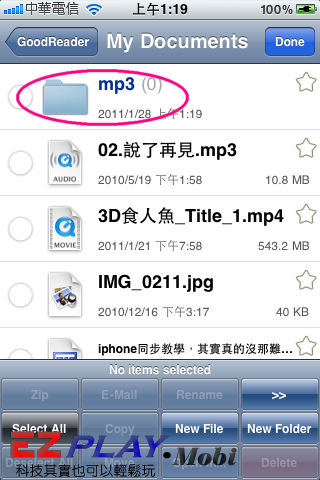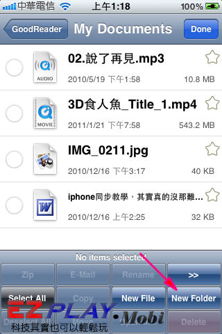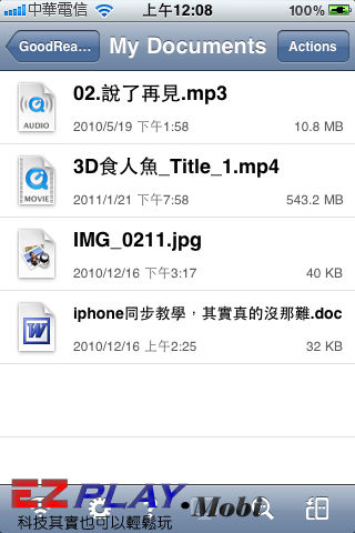 除了存放管理檔案外GoodReader選項裡可將資料文件用(E-mall、壓縮、移動檔案、建立資料夾)等等功能,點選[Actions]後選一個檔案會看到下面滿多功能鍵選擇。