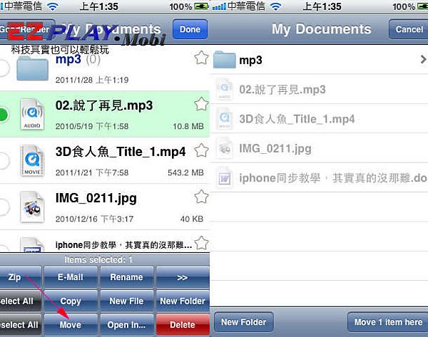 剛設立資料夾想要將檔案移動存放吧,點選[Move]後會畫面會顯示資料夾,選擇要存放位置按下[Move 1 item here]就跑到資料夾。