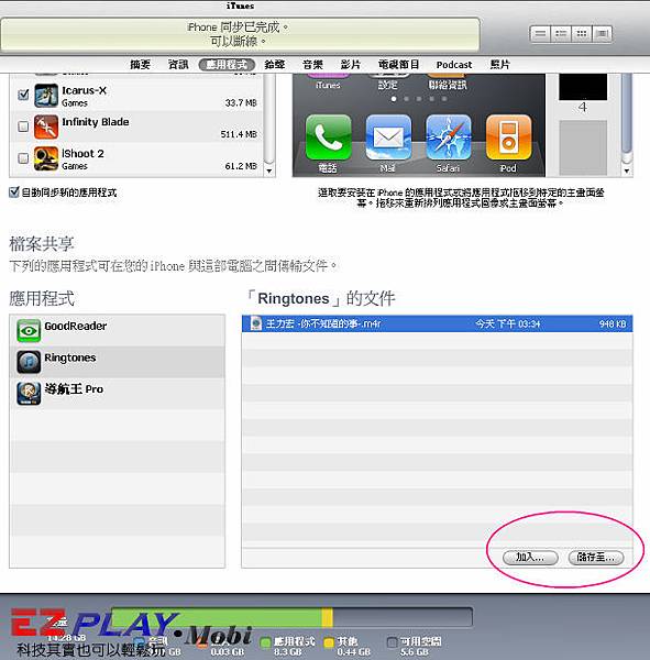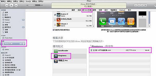 到我iPhone選【應用程式】,往下選下面【Ringtones】,就會看你製作好音樂鈴聲歌唱。