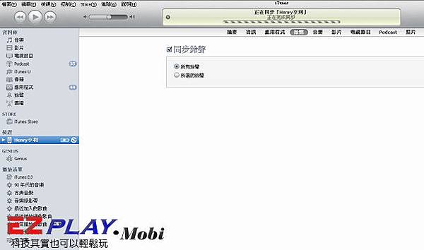 到我iPhone,選【鈴聲】按下套用同步後,就會同步到iPhone,【設定】【鈴聲】裡。