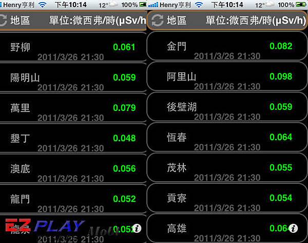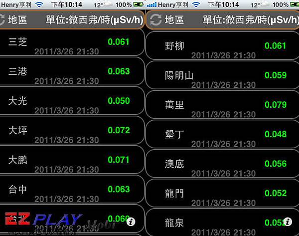 先到App Stort搜尋,【輻射偵測】程式安裝,執行後如畫面中,顯示臺灣各區輻射量。