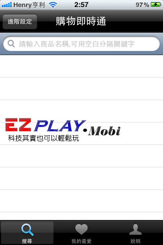 搜尋軟體安裝後,執行程序看到畫面,有幾個選項有【搜索】、【我的最愛】、【說明】跟【進階設定】功能鍵。