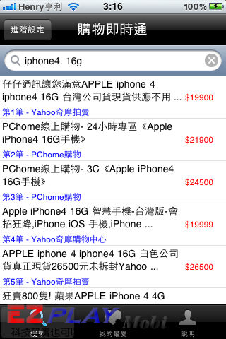 就在搜索欄位,輸入比較夯地iphone4產品搜尋看看,就會看各購物平台價格及資料,非常快速。