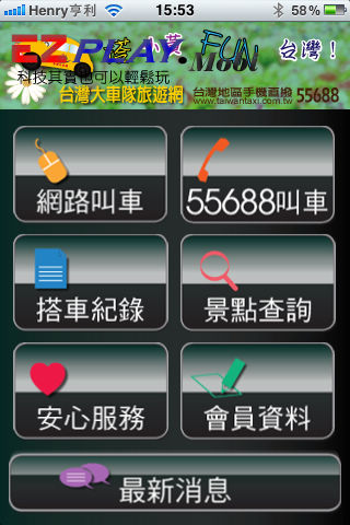 回首頁這裡,此選項功能有「網路叫車」、「55688叫車」、「搭車紀錄」、「景點查訊」、「安心服務」、「會員服務」、「最新消息」。