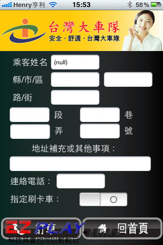 「地址訂車」:輸入聯絡資料及叫車地址後,按下確定「訂車」就可以,如要付費要刷卡方式,下面要記得勾選指定可刷卡車哦!