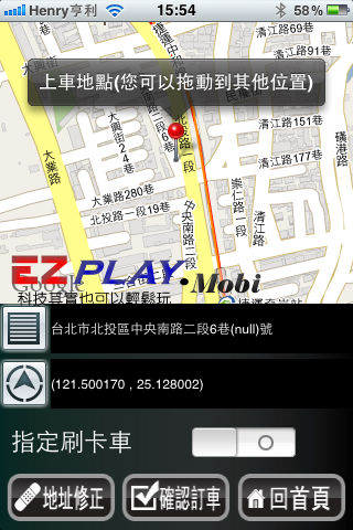 「GPS訂車」:首先要先確定iPhone定位服務有打開,點選GPS訂車就會幫你定位所在地方,也可以用拖曳方式選擇要叫車地方,左下角有個「地址修正」來更改地址,因GPS多少都有點誤差。