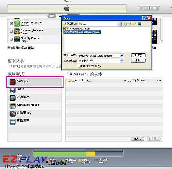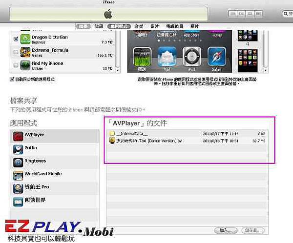 1. 打開iTunes到我xxx的iPhone應用程式,往下移到最下面會看「AVPlayer」文件夾,將你要播放檔案格式存放進去,也可以用檔案拖移方式,看你方便只要資料放對地方就好了。