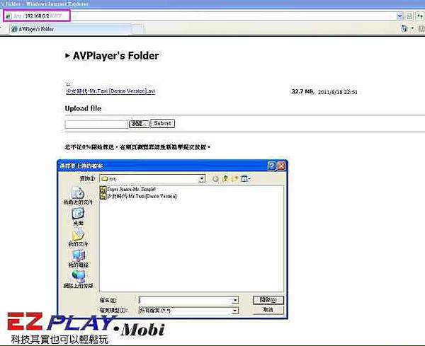 點選用HTTP/FTP會出現類似網路IP位置,然後打開你電腦IE瀏覽器,在左上角輸入http://192.xxx.xxx.1:8080,連線好會出現下面畫面,在把檔案存放進去在按「Sudmit」就可以了