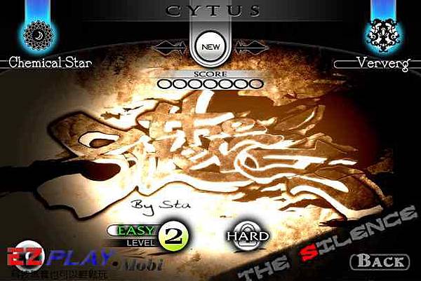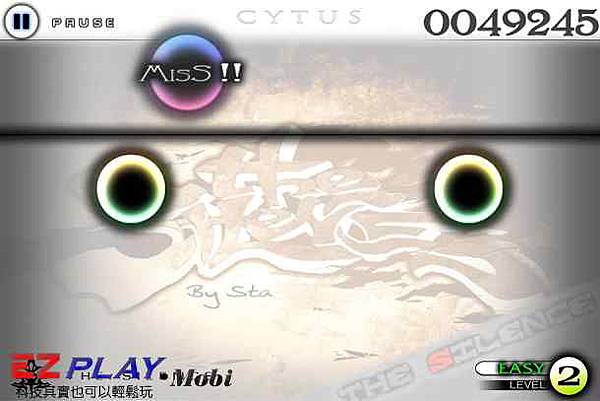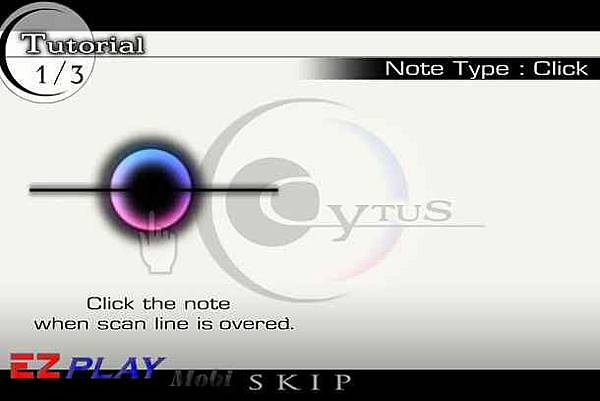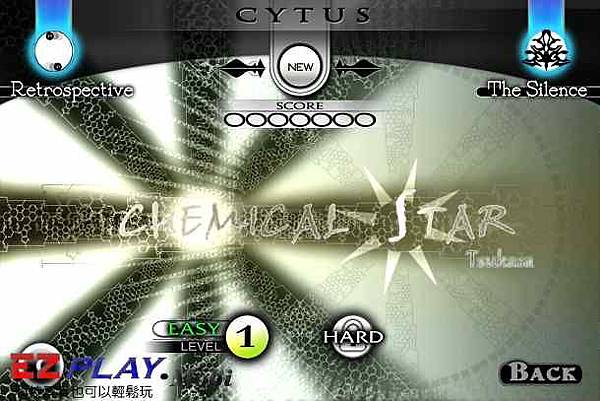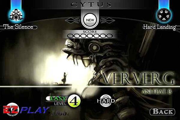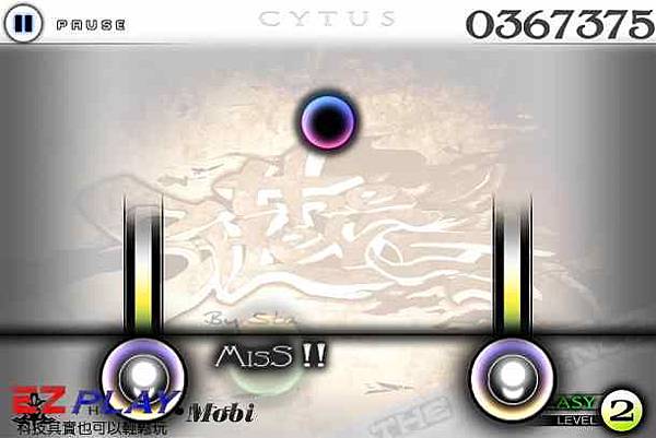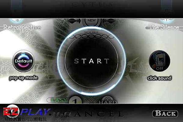 Cytus內建有15首音樂歌曲,每種曲目都有分簡單或困難兩種等級,進入第一關遊戲畫面,左右滑動可任意切換音樂曲風,選擇好遊戲困難或容易度後,點擊一下畫面中央開始音樂歌曲挑戰啊!