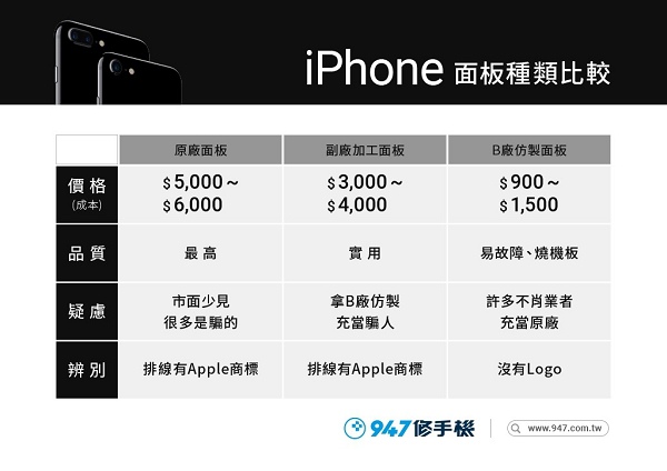 店家在維修,以下就歸類市面上的iphone面板總類比較表:
