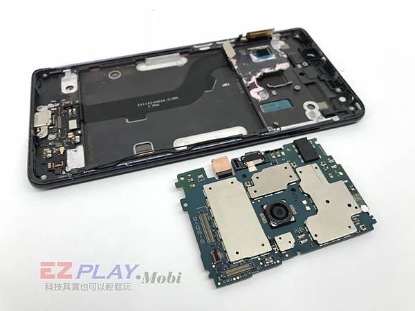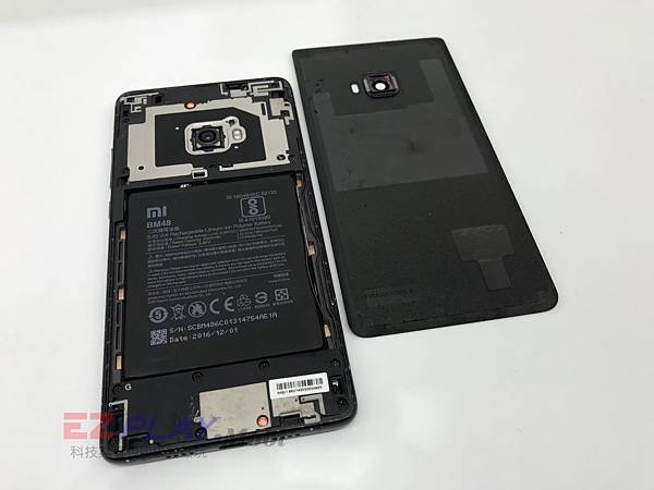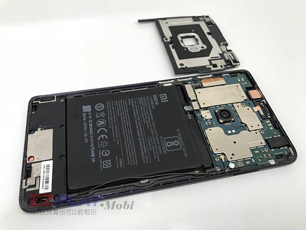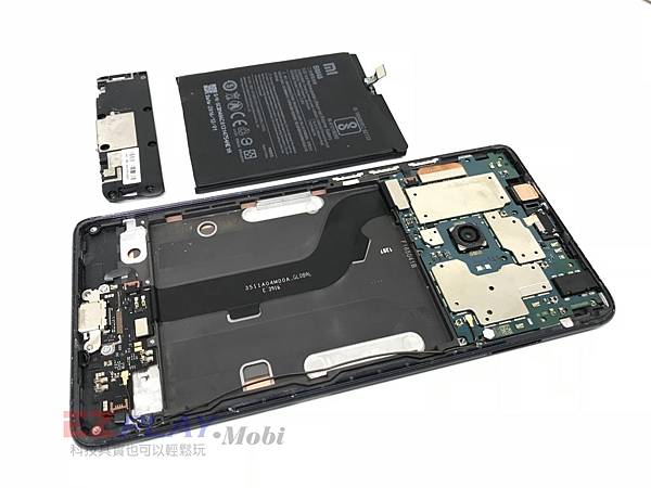 首先,我們先把小米NOTE2的背蓋拆開,打開以後我們就看到NOTE2的電池/主機板/前後相機/尾插排線的部分。