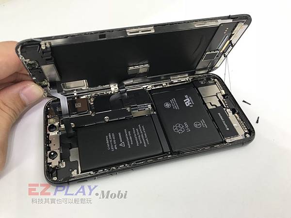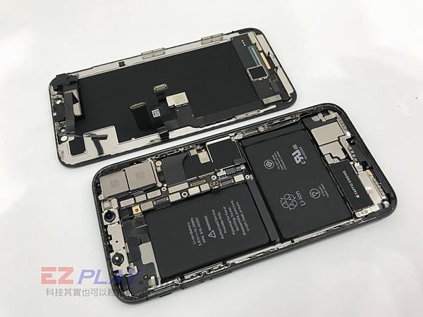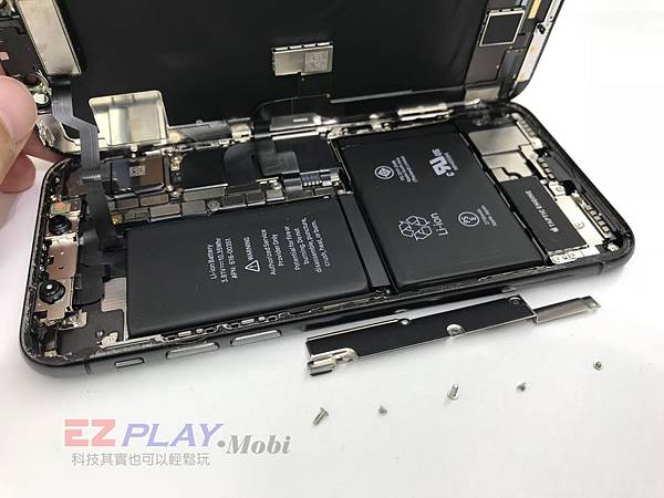 首先還是按照慣例,把底部的螺絲給卸下來,有發現到了什麼嗎?這次IPHONEX下方的兩個螺絲已經改變規格了,變得更長,接下來看到的就是主機板/後相機/前相機/電池,IPHONE X採用的是大容量的電池,這次使用了兩顆電池,續航力更持久。