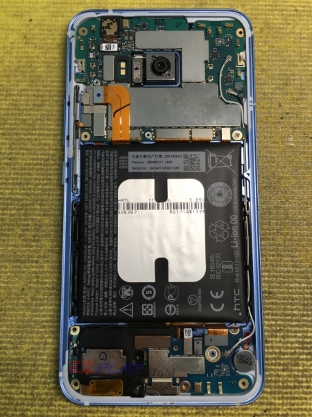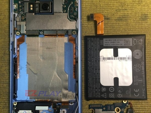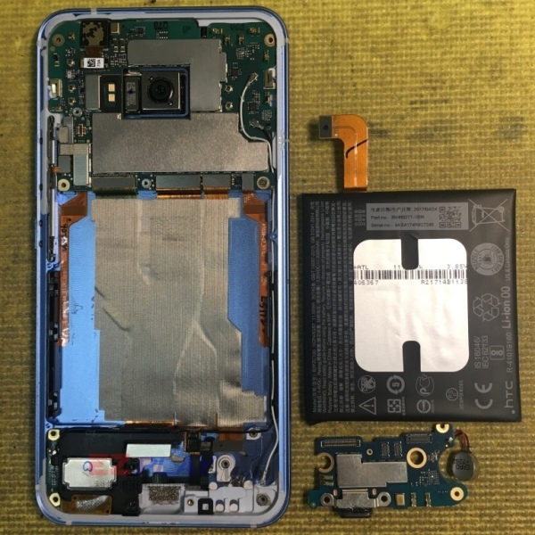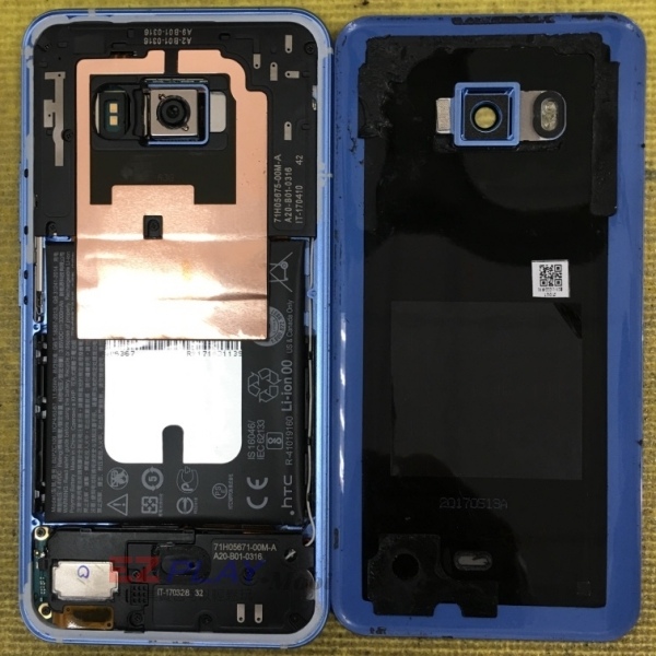 HTC U11 為了防水,背蓋部份使用了相當多的防水膠進行封蓋,由於背蓋用防水膠封蓋且又是玻璃材質取下背蓋需要方法,沒有專業工具及技術,小編個人建議別亂搞喔!不然搞壞手機可是要哭哭的,卸下背蓋後就可以看到手機的內部機構,最上方的主機板被天線蓋板給保護起來了,而最下方的充電模組小板也是被壓在下方的天線蓋板下。