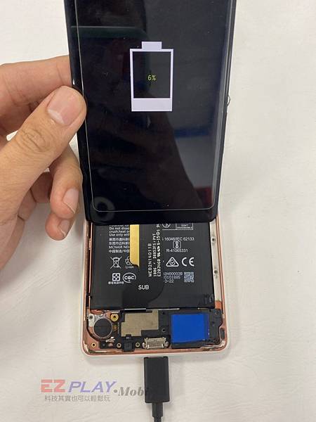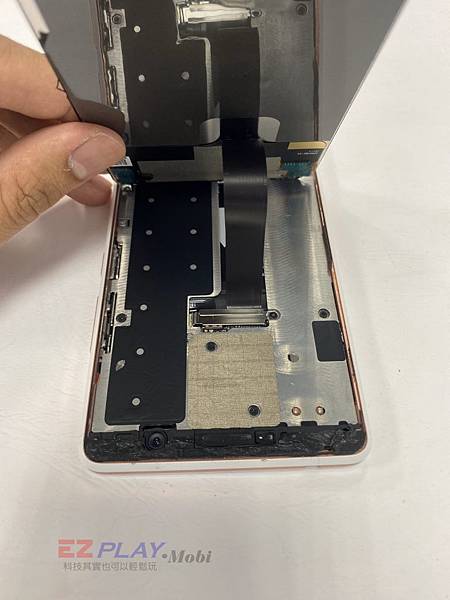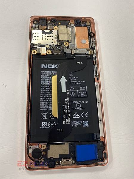再來我們把螢幕跟中框給卸下來,我們終於可以看到內部囉,有電池、主機板、震動器、響鈴、還有今天的主角尾插模組等等。